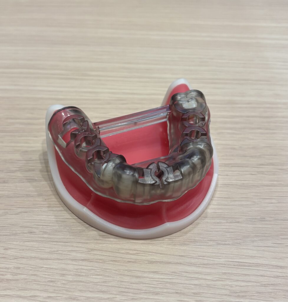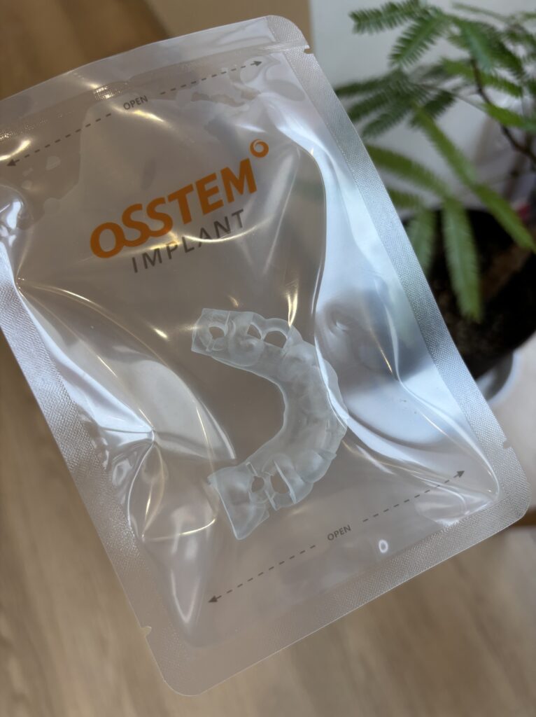 さて、当院では、CT(3次元のレントゲン),口腔内スキャナーの設備が揃っており、インプラント治療を行う際には、その2つのデータから「どこにインプラントを埋めればいいか安全で、長持ちするか」を考えてPC上でインプラント体の長さ、太さ、埋める位置、深さなどをデザインします。そのデザイン通りに手術が進められるように作られたガイド(写真)を用いて、安心安全に手術を行っております。